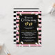 Cérémonie de désignation mignonne pour les jumelles avec des empreintes en blanc et or éparpillées sur un arrière - plan rayé noir et rose. La cérémonie de désignation est écrite dans un script charmant. Ajoutez les noms de vos jumeaux et les détails de la cérémonie de désignation.