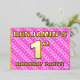 La façade de cette joyeuse carte d'invitation pour fêtes et fêtes d'anniversaire comporte un nom personnalisé, un grand numéro "1er", le message "FÊTE D'ANNIVERSAIRE !", et une frontière. L'arrière - plan de l'avant a un motif à rayures rose clair et rose foncé, optimiste, aux formes cardiaques. Le verso présente des détails personnalisés sur l'événement, tels que la date, l'heure, le lieu et toute autre information pertinente. Des invitations customisées comme celles-ci pourraient être une façon amusante pour les invités/participants invitations à une fête d’anniversaire organisée pour célébrer le 1er anniversaire de quelqu’un. [~Z0000603]