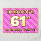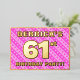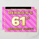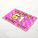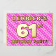 La façade de cette carte d'invitation de fête de soixante et unième anniversaire joyeuse et optimisée comporte un nom modifiable, un grand numéro "61e", le message "FÊTE D'ANNIVERSAIRE !", et une frontière. L'arrière - plan de l'avant présente un motif amusant rose foncé et rose clair rayures, aux formes cardiaques. Le verso présente des détails personnalisés sur l'événement, tels que la date, l'heure, le lieu/lieu et toute autre information qui peut être importante. Des invitations personnalisées comme celles-ci pourraient être une façon amusante pour les invités/participants invitations à une fête d’anniversaire organisée pour célébrer le 61e anniversaire de quelqu’un. [~Z0000603]