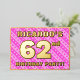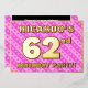 La façade de cette carte d'invitation à fêtes de soixante-deuxième anniversaire amoureuse et amusante comporte un nom modifiable, un grand numéro "62e", le message "FÊTE D'ANNIVERSAIRE !", et une frontière. L'arrière - plan de l'avant présente un motif joyeux avec des rayures rose clair et rose foncé et des formes cardiaques. Le verso présente des détails personnalisés sur l'événement, tels que la date, l'heure, le lieu/lieu et toute autre information importante. Des invitations personnalisables comme celles-ci pourraient être une façon amusante pour les invités invitations à une fête d’anniversaire qui se tient pour célébrer le 62e anniversaire de quelqu’un. [~Z0000603]