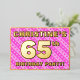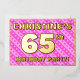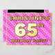 La façade de cette carte d'invitation à fêter et à fêter soixante-cinquième anniversaire amoureuse et amusante comporte un nom personnalisé, un grand numéro "65e", le message "FÊTE D'ANNIVERSAIRE !", et une frontière. L'arrière - plan de l'avant présente un motif joyeux avec des rayures rose foncé et rose clair et des formes cardiaques. Le verso présente des détails personnalisés sur l'événement, tels que la date, l'heure, le lieu et toute autre information qui peut être importante. Des invitations personnalisables comme celles-ci pourraient être une façon amusante pour les participants invitations/invités à une fête d’anniversaire qui se tient pour célébrer le 65e anniversaire de quelqu’un. [~Z0000603]