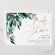 Élégante invitation de baby shower neutre pour les sexes, présente des feuilles d'eucalyptus aquarelle et des feuillages verts en cascade du coin supérieur gauche, agrémentés de touches roses de feuille d'or. Personnalisez avec les détails de votre baby shower alignés à droite. Cartes inversées à vert de forêt solide.