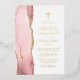 Le bord gauche de cette élégante invitation à la première communion moderne comporte une bordure d'aquarelle rose vif, ornée d'une fausse parties scintillant dorée. Une petite croix apparaît au-dessus du texte personnalisable, qui combine écriture manuscrite, copperplate et italique en véritable feuille d'or sur un arrière - plan blanc. L'envers est assorti d'un design d'agate en blush et or. Idéal pour la première communion d'une fille.