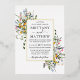 Le Faire-part de mariage moderne Elegant Watercolor Fleur sauvage comprend des fleurs sauvages jaunes, roses, violettes, bleues et blanches poussiéreuses, des feuilles d'eucalyptus, des feuilles verts sauge et d'autres plantes botaniques sur un cadre doré. Inclut un élégant script de calligraphie. Bleu Dusty Back.