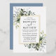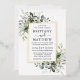 Le Faire-part de mariage moderne Elegant Greenery comprend une végétation botanique, des feuilles d'eucalyptus et des feuilles bleus poussiéreux. Bleu Dusty Back. Deux cadres - Double cadre - Gold Foil