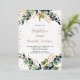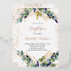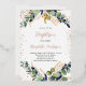 Un arrière - plan blanc décoré de verdure d'eucalyptus et de feuilles dorés et de parties scintillant en faux or tombe. Personnalisez et le nom de l'enfant et les détails de la cérémonie. Lettres noires et roses. Le texte en or rose est écrit avec du papier d'aluminium. Retour : arrière - plan blanc avec parties scintillant en faux or