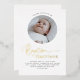Une Invitation Baptême moderne et minimale avec une photo ronde et le mot "Baptême" dans une police de style calligraphie. La typographie "Baptême de [nom de l'enfant]" est imprimée en papier doré. Veuillez noter que vous ne pouvez pas modifier le mot "Baptême" mais vous pouvez modifier tous les autres textes dans cette conception.