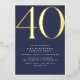 Style minimaliste moderne invitations à 40e anniversaire avec titre "40" texte en vrai papier métallique. Les détails de votre événement sont imprimés en blanc mat. Des accents d'or sur un arrière - plan bleu marine.