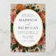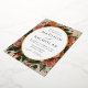 Élégantes invitations de mariage d'automne avec vos détails mariages nichés dans un cadre ovale en feuille d'or entouré de fleurs d'aquarelle et de verdure dans des couleurs automnales muettes d'ivoire, d'orange, d'or moutarde, de vert olive, de rose poussiéreux et de brun. Les invitations de mariage florales d'automne s'inversent pour montrer un riche arrière - plan d'aquarelle vert olive. Conçu pour coordonner avec notre collection Boho Autumn Floral mariage.
