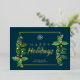 Classy moderne horizontale heureux vacances entreprises à la fois d'imprimer latéralement carte de voeux plat avec un endroit pour votre logo avec des feuilles de noël aquarelle classique et vrai doré cadre pressé et heureux texte de vacances sur un élégant turquoise foncé arrière - plan. Carte de voeux de Noël parfaite pour les entreprises, les petites entreprises, les entreprises à domicile, les employés, les entreprises de vacances ou toute organisation, le design moderne donnera à vos clients l'impression de luxe et de succès. Le côté arrière a un libellé personnalisé. Ce modèle de carte Happy Holidays est prêt pour votre personnalisation en ligne. La feuille d'or peut être changée en or ou argent rose. Ce magnifique crédit photo va à : Libby Penner