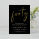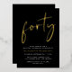 Élevez votre fête de 40ème anniversaire avec cette invitation noire chic avec "quarante" dans un script élégant et votre nom dans la typographie serif élégante, le tout rendu dans votre choix d'or authentique, argent ou feuille d'or rose, et les détails de la fête en lettres blanches simples et modernes.
