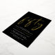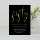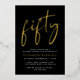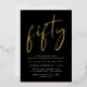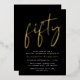Invitation à la soirée de 50ème anniversaire noir chic avec "cinquante" dans un script élégant et votre nom dans la typographie serif élégante, le tout rendu dans votre choix d'or authentique, argent ou feuille d'or rose, et les détails de la fête en lettres blanches simples et modernes.