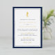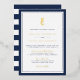 Des invitations de mariage élégantes au style nautique classique sont parfaites pour votre mariage de plage, de bord de mer ou de yacht club. Le design traditionnel comprend des lettres de serif et de script classiques en bleu marine avec des accents de feuille d'or, une double bordure bleu marine et un cheval de mer en feuille d'or au sommet.