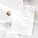 Élégantes invitations à un mariage floral avec une bordure supérieure de fleurs en feuille d'argent dainty avec un arrière - plan blanc. Personnalisez les invitations de mariage floral en papier d'aluminium avec vos noms et détails mariages en lettres d'argent avec accents de script de calligraphie. Conçu pour coordonner avec notre collection de mariages floraux Dainty.