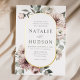 Élégantes invitations de mariage florales hivernales avec vos détails mariages affichés en lettrage vert foncé niché à l'intérieur d'un cadre floral ovale en feuille d'or. Les fleurs d'hiver sont recouvertes d'une palette de couleurs de rose, rose clair, ivoire et jaune doré doux, avec des feuilles d'eucalyptus et des feuillages d'hiver dans des tons vert sauge et vert forêt riche.