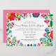 Parfait pour un événement de destination ou une soirée mexicaine, cette invitation à dîner de répétition horizontale et entièrement personnalisée présente un cadre de fleurs et de feuillage inspiré par la broderie colorée d'artisans mexicains autochtones et avec des accents brillants de feuille d'or rose en relief, le tout contre un arrière - plan blanc propre.