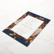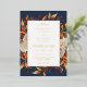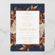 Cette faire-part de mariage élégante et moderne présente une belle armature d'aquarelle boho peinte à la main, des feuilles orange brûlé et en terre cuite, des dahlias crème et beige, et de beaux roses de couleur rouille sur un arrière - plan bleu marine imprimé en véritable feuille d'or. Trouvez les articles correspondants dans la collection Marine Blue Autumn Romance.