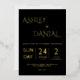 Ce magnifique faire-part de mariage en feuille de noir et or est parfait pour une célébration sophistiquée et luxueuse. La luxueuse typographie or se distingue par son arrière - plan noir classique, créant un look intemporel et élégant. La feuille d'or ajoute une touche unique qui montrera à vos invités à quel point votre grand jour est spécial. Cette invitation impressionne vos amis et votre famille, et sera un rappel durable de votre belle journée de mariage.