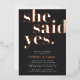 Les invitations aux fêtes de fiançailles modernes et minimalistes présentent un style chic noir et blanc avec "elle a dit oui" dans des lettres rétro roses surdimensionnées en feuille d'or. Personnalisez avec les détails de votre célébration fiançailles sous. Les invitations se retournent vers un motif d'étoiles colorées.