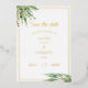 Ton romantisme est à feuillage persistant. Cette feuille d'or éclatante Save The Date propose un cadre d'or réel avec des feuilles d'eucalyptus peints dans les coins sur un arrière - plan blanc. Dans le cadre, vos noms et détails mariages sont affichés dans de véritables polices élégantes de feuille d'or. L'arrière est ornée de feuilles d'eucalyptus sur un simple arrière - plan vert clair. Certaines images sont également amovibles. Customisez-le avec vos propres détails