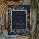 Elégant faire-part de mariage botanique encadre vos détails de célébration mariages avec une bordure d'aquarelle d'eucalyptus feuilles, fleurs bleues et feuillage vert sur un arrière - plan bleu marine moody. Le fini en feuille d'or de luxe complète le design.