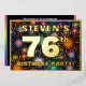 La façade de cette passionnante carte d'invitation de soixante-seizième anniversaire comporte un nom personnalisé, un grand numéro "76e", le message "FÊTE D'ANNIVERSAIRE !", et une frontière. L'arrière - plan du devant présente un motif coloré et accrocheur inspiré par les feux d'artifice de la fête. Le verso présente des détails personnalisés sur l'événement, tels que la date, l'heure, le lieu/lieu et toute autre information qui peut être utile. Des invitations personnalisables comme celles-ci pourraient être une façon amusante pour les invités et les participants invitations à une fête d’anniversaire organisée pour célébrer le 76e anniversaire de quelqu’un. [~Z0000602]