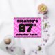 La façade de cette carte d'invitation pour fêter quatre-vingt-septième anniversaire et fêter un festin, est dotée d'un nom personnalisé, d'un grand numéro "87th", du message "BANTHDAY PARTY!" et d'une frontière. L'arrière - plan de l'avant présente un joyeux motif rose clair et rose foncé à rayures contenant des formes cardiaques. Le verso présente des détails personnalisés sur l'événement, tels que la date, l'heure, le lieu et toute autre information importante. Des invitations personnalisées comme celles-ci pourraient être une façon amusante pour les invités invitations à une fête d’anniversaire ou à une réunion qui se tient pour honorer le 87e anniversaire de quelqu’un. [~Z0000603]