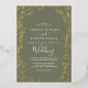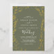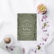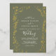 Cette carte d'invitation à la feuille d'or minimal vert foncé vert mariage est parfaite pour un mariage de saumons. Le design se compose d'une simple silhouette de feuille de verdure en feuille d'or pressée et luxueuse sur un arrière - plan vert olive au style bohème minimaliste de montagne.