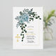 Des fleurs d'aquarelle bleu poussiéreux et l'arche printemps et été baptisme invitation pour les garçons. Ce joli design présente une arche avec des fleurs de cactus bleues et des feuilles verts en haut à gauche et une véritable croix de feuille d'or. L'expression "baptême" est dans la typographie de script.