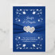 Ce faire-part de mariage romantique a de véritables arcs floraux en feuille d'argent au-dessus et au-dessous d'un ruban bleu royal IMPRIMÉ et simulé parties scintillant d'argent et broche cardiaque à joint cristal au centre d'un arrière - plan bleu. Les noms du couple heureux apparaissent en blanc au-dessus du ruban, avec le verset personnalisable au-dessous du ruban qui dit : "Deux vies, deux coeurs, unis ensemble par l'amitié, unis pour toujours dans l'amour". Le côté arrière de l'invitation est gris avec un rouleau décoratif bleu royal et un cadre fleuri autour du libellé en bleu avec la même paire de coeurs doubles au fond entre les arcs fleuris. Des détails RSVP sont également disponibles à l'arrière de l'invitation, ce qui en fait une faire-part de mariage abordable et luxueuse qui saura enchanter vos invités mariages.