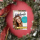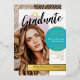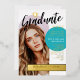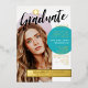 Invitation de la fête de remise de diplômes rétro personnalisée avec une photo en arc sur la couverture et une deuxième photo couvrant le dos. Diplômé écrit dans un script de brosse noire à travers l'invitation de graduation. Couleurs or et accent turquoise. Invitation de graduation élégante et féminine en feuille turquoise, blanche, noire et or