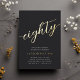 Célébrez son anniversaire d'étape avec ces invitations chic à la fête de 80e anniversaire avec "quatre-vingts" en écriture manuscrite de feuille d'or moderne. Personnalisez avec les détails de votre fête en dessous. Un choix inoubliable et luxueux pour fabuleuses célébrations du 80e anniversaire.