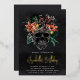Une éffrayante invitation à la fête d'anniversaire d'Halloween avec une illustration d'un crâne tropical fleuri, surmonté de fleurs d'île orange et bordeaux et de feuillage vert de jungle sur un arrière - plan noir fumé. Personnalisez cette invitation unique et élégante à la fête d'anniversaire d'Halloween avec vos détails de l'événement en lettres blanches. Les accents en feuille d'or donnent un caractère luxueux à cette magnifique invitation.