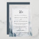 Élégante invitation de mariage hivernal, un arrière - plan d'aquarelle représentant un paysage de montagne enneigé parsemé de pins dans les nuances brumeuses de bleu et de gris. Personnalisez avec vos détails mariages en lettrage doux et doux, surmonté de votre monogramme ou de votre duogramme, accompagné d'un esperluette décoratif. Un beau choix pour des mariages d'hiver élégants en montagne ou en forêt. La garniture en feuille d'argent complète le design pour un look luxueux.