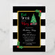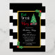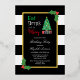 Mangez, buvez et soyez joyeux Noël anniversaire invitation avec un arbre de Noël et des cadeaux contre un cadre d'or. Arrière - plan rayé noir et blanc avec saint