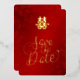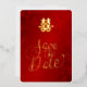 Cette carte Save the Date présente un symbole de bonheur double or artistique et un script calligraphique sur un arrière - plan floral rouge chatoyant.