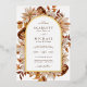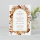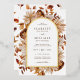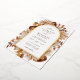 Cette élégante invitation de mariage comprend un cadre en feuille d'or et des feuilles d'orange et de terre cuite peints à la main, des dahlias crème et beige, et de beaux roses couleur rouille sur un arrière - plan blanc. Trouvez les articles correspondants dans la collection White Autumn Romance.