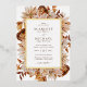 Invitation Mariage de automne Aquarelle Foil. Cette élégante invitation de mariage comprend un cadre en feuille d'or et des feuilles d'orange et de terre cuite peints à la main, des dahlias crème et beige, et de beaux roses couleur rouille sur un arrière - plan blanc. Trouvez les articles correspondants dans la collection White Autumn Romance.