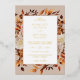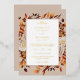 Cette faire-part de mariage élégante et moderne dispose d'un beau cadre d'aquarelle boho peinte à la main, de feuilles orange brûlé et en terre cuite, de dahlias crème et beige, et de beaux roses couleur rouille sur un arrière - plan taupe imprimé en véritable feuille d'or. Trouvez les articles correspondants dans la collection Taupe Autumn Romance.