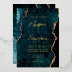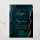 Cette élégante invitation de mariage présente une image arrière - plan d'agate bleue turquoise parée de parties scintillant en faux or. Le texte personnalisable combine écriture manuscrite moderne couleur or, cuivre et polices italiques. L'envers dispose d'un design d'agate turquoise et or coordonné.