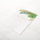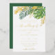 Cette élégante invitation à un mariage présente une aquarelle de feuilles tropicaux luxuriants dans les tons verts. Les feuilles sont habillés de papier doré, ce qui ajoute une touche de luxe. Le texte est imprimé dans une police stylisée de script de calligraphie de feuille d'or, qui est facile à lire contre l'arrière - plan blanc. Cette invitation est parfaite pour un mariage d'été ou un mariage de destination dans un cadre tropical.