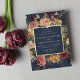 D'élégantes invitations à des mariages fleuris ou des mariages d'automne ou d'hiver présentent vos détails encadrés de roses d'aquarelle, de mamans et de verdure dans des couleurs d'automne rustiques incluant pêche, ivoire, rougissant, bordeaux et vert, avec des garnitures en feuille d'or sur un arrière - plan bleu marine. Un design moderne et élégant pour des mariages rustiques chic en automne ou en hiver.