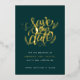 Carte de Mariage Moderne Écriture Calligraphique Vert Émeraude avec feuille d'or pour annoncer votre mariage.