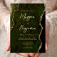 Cette élégante invitation de mariage présente une image arrière - plan d'agate vert d'olivier parée de parties scintillant en faux or. Le texte personnalisable combine écriture manuscrite moderne couleur or, cuivre et polices italiques. L'envers présente un design coordonné d'agate vert olive et or.