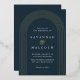 Invitations officielles de mariage avec une arche métallique doublée encadrant les détails de votre cérémonie. Bleu bleu marine foncé avec feuille d'or.