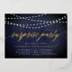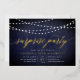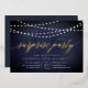 Nos invitations festives festives dans le chic bleu et blanc de minuit présentent un arrière - plan bleu de minuit richement texturé avec des cordes de lumières blanches sur le dessus, et "fête surprise" dans la chic feuille d'or typographie script de calligraphie. Personnalisez avec vos détails de fête surprise sous blanc; peut être utilisé pour n'importe quelle occasion, comme les fêtes d'anniversaire ou les fêtes d'anniversaire. Un design chic en bleu marine foncé et blanc pour des événements élégants.
