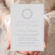 Cet élégant design d'invitation de mariage comprend un script monogramme initialement encerclé par une couronne d'art en ligne botanique. Les noms apparaissent dans le script de papier argenté réel, avec le reste du texte dans la police serif classique sur un arrière - plan gris pâle. Le dos de la carte est gris solide.