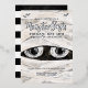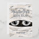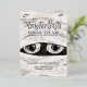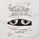 Monster bash enveloppé sur le thème de la maman Halloween partie réelle fil invitation design. Le design présente notre propre illustration dessinée à la main d'une vue rapprochée d'un visage de monstre de momie enveloppé. "Monster Bash" s'affiche dans une écriture manuscrite stylisée avec les détails de la fête d'Halloween affichés sur l'illustration squelette pour créer un design audacieux et unique d'invitation de fête d'Halloween. L'envers présente un motif gris et rustique rayé noir. Toutes les illustrations contenues dans cette invitation à thème momie Halloween sont dessinées à la main par Moodthology.