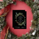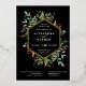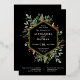 Ce magnifique faire-part de mariage de vacances dispose d'un cadre géométrique en feuille d'or avec des feuilles or assortis, de la verdure de Noël et des baies rouges sèches sur un arrière - plan noir moderne. Parfait pour votre mariage d'hiver élégant.