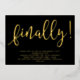 Une simple invitation typographique à une partie d'engagement. Ce design comporte le mot "enfin !" en gras feuille d'or, en caractères de police et détails de la fête en caractères sans serif modernes, le tout sur un arrière - plan noir.